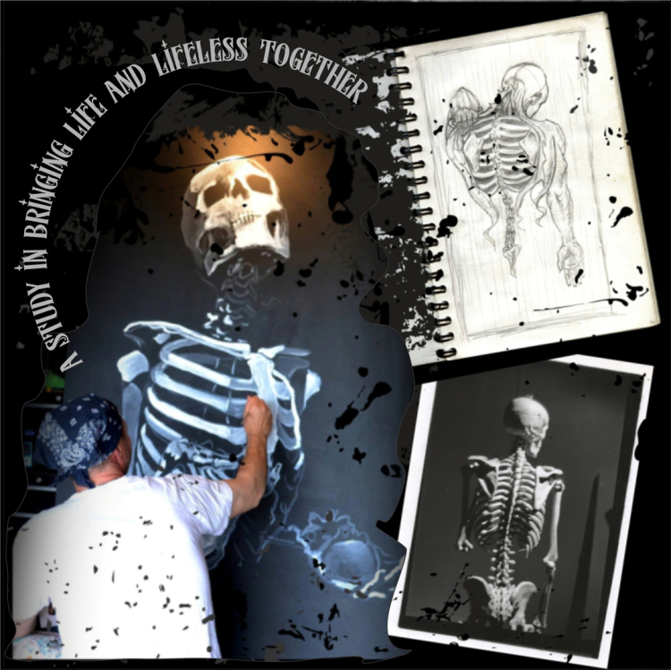 Back in 1994 when I was an Art Major at Northern Illinois University I began to explore the development of this series. Inspired by music, movies and culture, I sketched out an image that was initially much darker and macabe then the subsequent paintings. It was never my intention to depict something gory or grotesque, but I wanted to bring living flesh together with the lifeless skeleton. I also wanted these figures to pose in familiar gestures so that people would identify with them more. After completing the first piece of the series, it became more clear to me what the subject matter and style was going to be for the next paintings. After I decide how the composition will look, I conduct a photoshoot with the sketelton and the human model using a single light source and various poses. I then use those images to composite the final image that will be used as the reference for the painting. I find that there are many interesting ideas that come from this concept and I am still developing it.