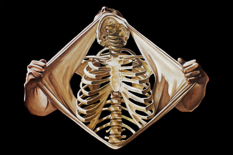 This is the latest installment of the series and my favorite. Instead of having a face at the top this piece, it depicts a beautiful skeletal neck that to me is as interesting as a face. I find many aspects of this composition to be very successfull. The stretching of the skin across the bottom was a perfect way to end the image without bleeding off the canvas. The presentation of this idea is so compelling that the viewer does not question how something like this can even occur.